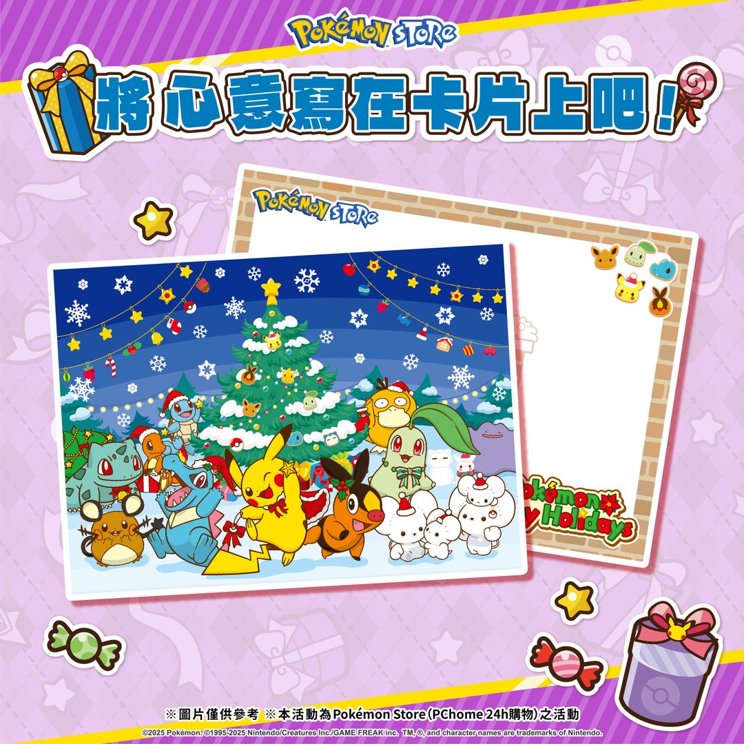 在PChome 24h購物「Pokémon Store」消費滿$490(含稅)以上的顧客,即可獲得「Pokémon Store 明信片 (2025 Happy Holiday)」1張!