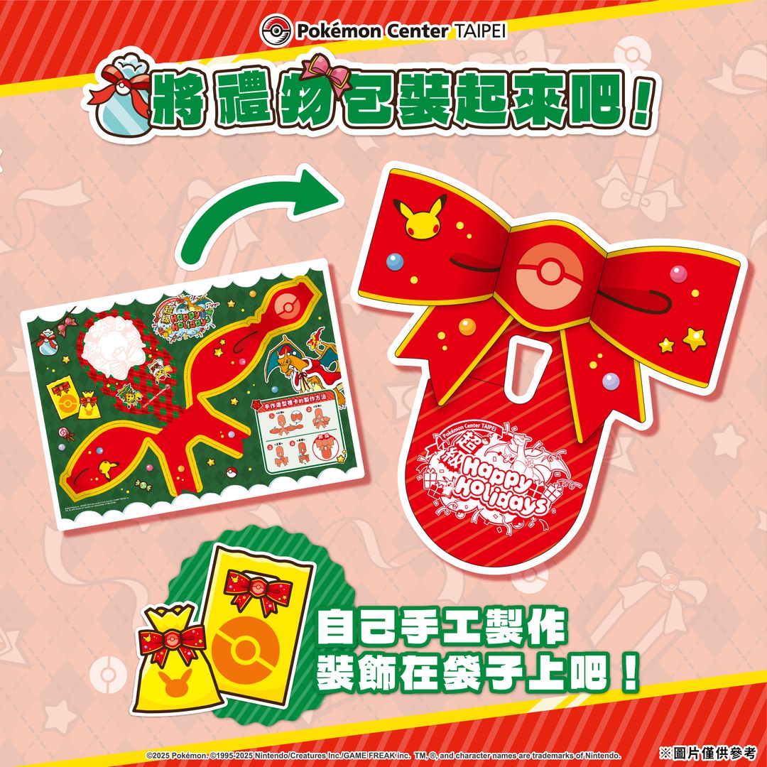組裝後,可當作緞帶繫在寶可夢中心的購物袋上,為禮物增添充滿聖誕氛圍的裝飾吧!